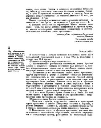 Из объяснительной записки к отчетной карточке о боевой и оперативно-служебной деятельности 127-го пограничного Померанского полка войск по охране тыла 1-го Белорусского фронта за май 1945 г. 30 мая 1945 г.