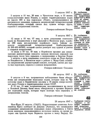 Из сообщения Главного управления пограничных войск СССР в МИД СССР об облете американским самолетом советского судна в советских территориальных водах. 3 августа 1947 г.