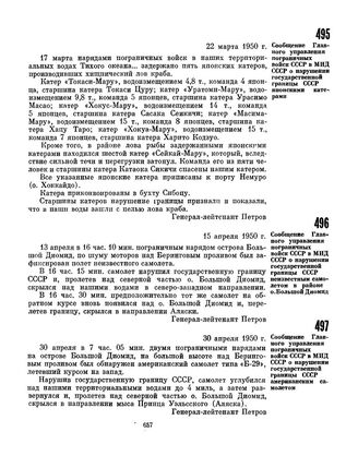 Сообщение Главного управления пограничных войск СССР в МИД СССР о нарушении государственной границы СССР неизвестным самолетом в районе о. Большой Диомид. 15 апреля 1950 г.