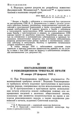 Постановление СНК о Революционном трибунале печати. 28 января (10 февраля) 1918 г. // Печатается по тексту сборника «Декреты Советской власти», том I, стр. 432—434.