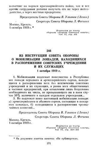 Из инструкции Совета Обороны о мобилизации лошадей, находящихся в распоряжении советских учреждений и их служащих. 1 октября 1919 г. // Печатается по тексту сборника «Декреты Советской власти», том VI, стр. 453—455.