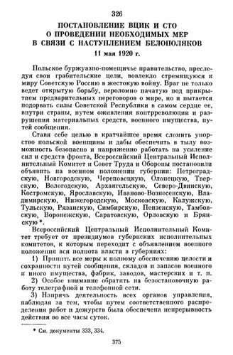 Постановление ВЦИК и СТО о проведении необходимых мер в связи с наступлением белополяков. 11 мая 1920 г. // Печатается по тексту газеты «Известия ВЦИК» № 101, 12 мая 1920 г.