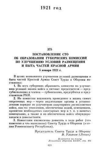 Постановление СТО об образовании губернских комиссий по улучшению условий размещения и быта частей Красной Армии. 5 января 1921 г.