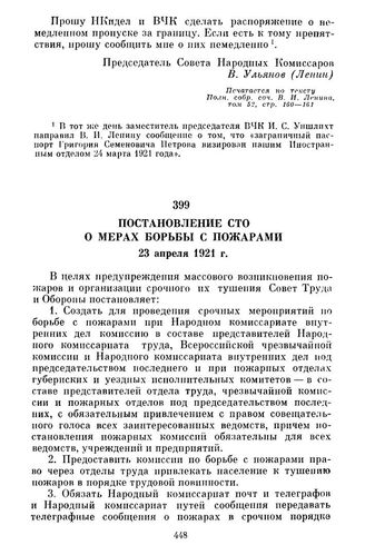 Постановление СТО о мерах борьбы с пожарами. 23 апреля 1921 г. // Печатается по тексту «Известий ВЦИК» № 98, 8 мая 1921 г.