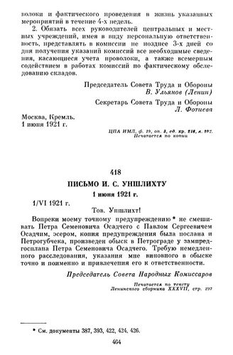 Письмо И.С. Уншлихту. 1 июня 1921 г. // Печатается по тексту Ленинского сборника XXXVII, стр. 297.