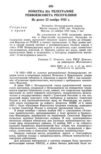 Пометка на телеграмме Реввоенсовета Республики. Не ранее 22 ноября 1921 г. // ЦПА ИМЛ, ф. 2, оп. 1, ед. хр. 22115. Печатается по рукописи.