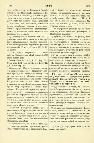 1896. Мая 23. — О пособии из казны на устройство и содержание ремесленного класса ручного труда при Покровском сельском училище, Самарской губернии // Дело Деп. Нар. Просв. 1894 г., № 108 (разр. нач. учил.).