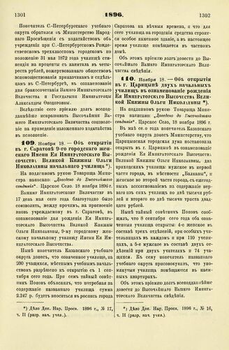 1896. Ноября 18. — Об открытии в г. Царицыне двух начальных училищ в ознаменование рождения Ее Императорского Высочества Великой Княжны Ольги // Дело Деп. Нар. Просв. 1896 г., № 16, ч. II (разр. нач. учил.).
