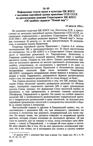 Информация отдела науки и культуры ЦК КПСС о заседании партийной группы правления ССП СССР по рассмотрению решения Секретариата ЦК КПСС «Об ошибках журнала «Новый мир». 12 августа 1954 г. // РГАНИ. Ф. 5. Oп. 17. Д. 488. Л. 87-91. Подлинник. Частично опубл.: Петров А. М. «Едва раскрылись первые цветы...»: «Новый мир» и общественные умонастроения в 1954 году // Дружба народов. № 11. С. 208-239.