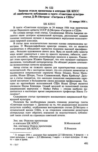 Записка отдела пропаганды и агитации ЦК КПСС об ошибочности публикации в газете «Советская культура» статьи Д. Ф. Ойстраха «Гастроли в США». 31 января 1956 г.