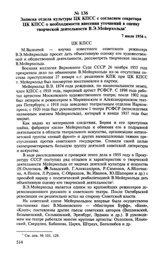 Записка отдела культуры ЦК КПСС с согласием секретаря ЦК КПСС о необходимости внесения уточнений в оценку творческой деятельности В. Э. Мейерхольда. 7 июля 1956 г.