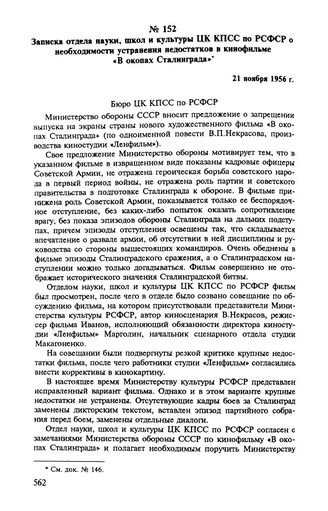 Записка отдела науки, школ и культуры ЦК КПСС по РСФСР о необходимости устранения недостатков в кинофильме «В окопах Сталинграда». 21 ноября 1956 г.