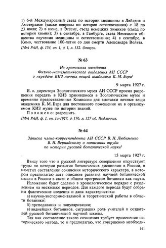 Записка члена-корреспондента АН СССР В. Н. Любименко В. И. Вернадскому о написании труда по истории русской ботанической науки. 15 марта 1927 г. // ПФА РАН, ф. 154, оп. 1, д. 1, л. 147—148. Автограф.