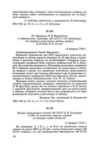 Из обращения В. И. Вернадского к непременному секретарю АН СССР С. Ф. Ольденбургу об отправке родословных таблиц предков К. М. Бэра Н. К. Эссену. 14 февраля 1928 г. // ПФА РАН, ф. 154, оп. 1, д. 13, л. 62—62 об. Отпуск.