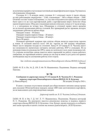 Сообщение от директора завода № 153 имени В. П. Чкалова П. С. Романова первому секретарю Новосибирского обкома ВКП(б) М. В. Кулагину. [г. Новосибирск], Не позднее 26 марта 1943 г. // ГАНО. Ф. П. 4. Оп. 7. Д. 547. Л. 77. Машинопись. Подлинник. Подпись-автограф П. С. Романова.