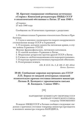 Резиденты сообщают…: Сб. док. о политической обстановке в Латвии, Литве и Эстонии, август 1939 г.-август 1940 г. — М.: Фонд «Ист. память», 2020.