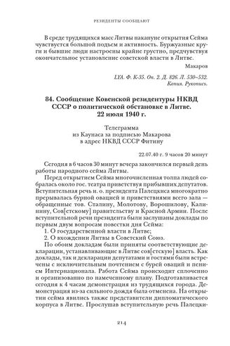 Сообщение Ковенской резидентуры НКВД СССР о политической обстановке в Литве. 22 июля 1940 г. // LYA. Ф. К-35. Оп. 2. Д. 826. Л. 535–536. Копия. Рукопись.