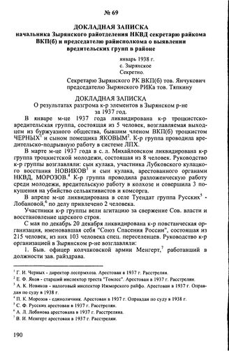 Докладная записка начальника Зырянского райотделения НКВД секретарю райкома ВКП(б) и председателю райисполкома о выявлении вредительских групп в районе. Январь 1938 г., с. Зырянское // ЦДНИ ТО. Ф. 28. Оп. 1. Д. 204. Л. 5-6. Подлинник. Машинопись.