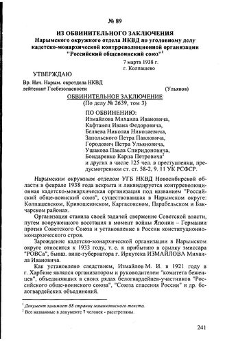 Из обвинительного заключения Томского оперативного сектора НКВД по уголовному делу кадетско-монархической контрреволюционной организации "Российский общевоинский союз". 7 марта 1938 г., г. Колпашево // Архив УФСБ Томской области. Д. П-1239. Т. З. Л. 1385-1389, 1472-1473. Подлинник. Машинопись.