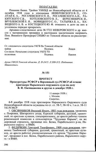 Протест Прокуратуры РСФСР в Верховный суд РСФСР об отмене приговора Нарымского окружного суда по делу В.И. Овсянникова и других в декабре 1938 г. 11 января 1958 г., г. Москва // Архив УФСБ Томской области. Д. П-3643. Л. 427-430. Подлинник. Машинопись.