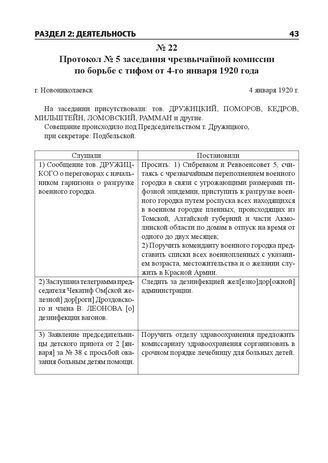 Протокол № 5 заседания чрезвычайной комиссии по борьбе с тифом от 4-го января 1920 года. г. Новониколаевск, 4 января 1920 г.