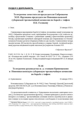 Телеграмма руководства ж.-д. станции Кривощеково в Новониколаевскую губернскую чрезвычайную комиссию по борьбе с тифом. ст. Кривощеково, 26 января 1920 г. // ГАНО. Ф. Р-34. Оп. 1. Д. 82. Л. 34–35. Бланк телеграммы.