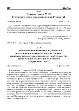 Отношение Новониколаевского губернского революционного комитета о предоставлении санитарно-исполнительной комиссии при Губчекатифе чрезвычайных полномочий по вопросам оздоровления города. г. Новониколаевск, 21 февраля 1920 г. // ГАНО. Ф. Р-34. Оп. 1. Д. 1. Л. 76. Машинописная заверенная копия.
