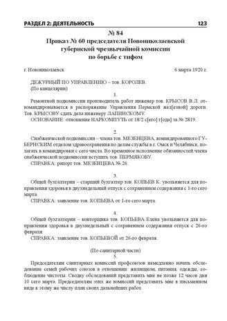 Приказ № 60 председателя Новониколаевской губернской чрезвычайной комиссии по борьбе с тифом. г. Новониколаевск, 6 марта 1920 г. // ГАНО. Ф. Р-34. Оп. 1. Д. 30. Л. 27–28об. Машинописная заверенная копия.