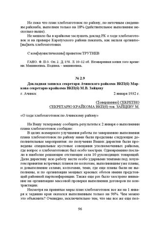 Докладная записка секретаря Ачинского райкома ВКП(б) Маркова секретарю крайкома ВКП(б) М.В. Зайцеву. г. Ачинск, 2 января 1932 г. // ГАНО. Ф. П-3. Оп. 2. Д. 205. Л. 7–8. Подлинник. Машинопись с рукописными вставками. Подпись – автограф.
