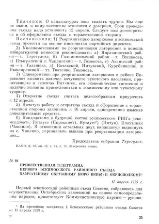 Приветственная телеграмма первого эскимосского районного съезда Камчатскому окружному бюро ВКП(б) и окрисполкому. 17 апреля 1929 г. // ЦГА РСФСР ДВ, ф. р.-4315, оп. 1, д. 20, л. 8. Заверенная копия.