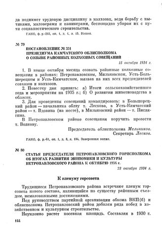 Статья председателя Петропавловского горисполкома об итогах развития экономики и культуры Петропавловского района к октябрю 1934 г. 23 октября 1934 г. // «Камчатская правда», 1934, 23 октября.