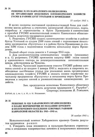 Решение № 1225 Хабаровского крайисполкома о плане мероприятий по оседанию кочевого и полукочевого населения северных районов Камчатской области на 1943—1945 гг. 26 ноября 1943 г. // ГАХК, ф. 137, оп. 4, д. 837, л. 35. Подлинник.