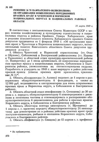 Решение № 78 Камчатского облисполкома об организации комплексных передвижных красных яранг в Чукотском и Корякском национальных округах и национальных районах области. 25 марта 1949 г.