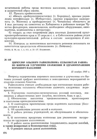 Циркуляр Ольского райисполкома сельсоветам района по вопросам улучшения снабжения и здравоохранения коренного населения. 15 ноября 1949 г.