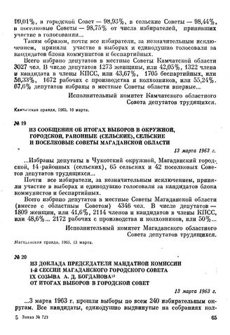 Из сообщения об итогах выборов в окружной, городской, районные (сельские), сельские и поселковые Советы Магаданской области. 13 марта 1963 г. // Магаданская правда, 1963, 13 марта.