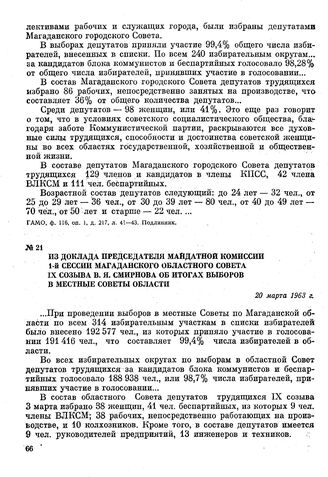 Из доклада председателя мандатной комиссии 1-й сессии Магаданского областного Совета IX созыва В. Я. Смирнова об итогах выборов в местные Советы области. 20 марта 1963 г. // ГАМО, ф. 146, оп. 1, д. 504, л. 82—85. Подлинник.