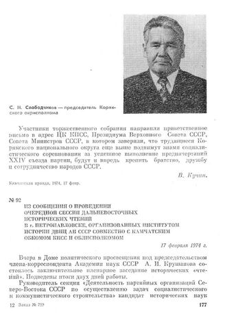 Из сообщения о проведении очередной сессии Дальневосточных исторических чтении в г. Петропавловске, организованных Институтом истории ДВНЦ АН СССР совместно с Камчатским обкомом КПСС и облисполкомом. 17 февраля 1974 г.