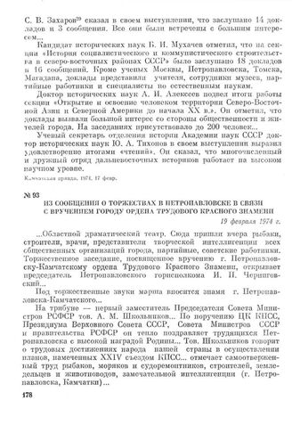 Из сообщения о торжествах в Петропавловске в связи с вручением городу ордена Трудового Красного Знамени. 19 февраля 1974 г. // Камчатская правда, 1974, 19 февр.