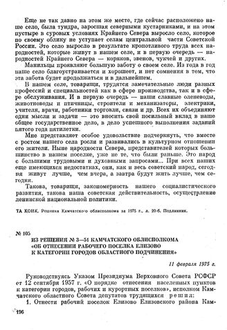 Из решения № 3-51 Камчатского облисполкома «Об отнесении рабочего поселка Елизово к категории городов областного подчинения». 11 февраля 1975 г. // ТА КОИК. Протоколы заседаний Камчатского облисполкома за 1975 г., л. 331. Подлинник.