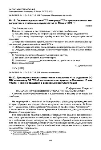 Письмо председателя ГПУ зампреду ГПУ о предполагаемых мероприятиях в отношении студенчества от 15 мая 1922 г. // ЦА ФСБ РФ. Ф. 1. Оп. 6. Д. 7. Л. 213. Машинописная копия.