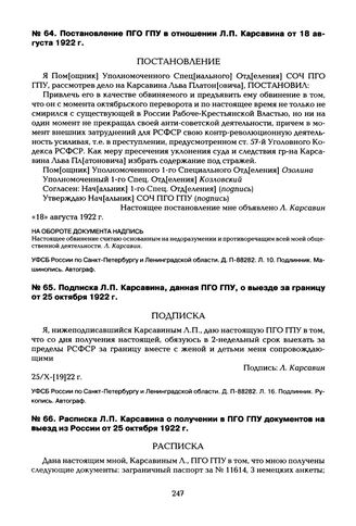 Главная Высылка вместо расстрела. Депортация интеллигенции в документах ВЧК... Постановление ПГО ГПУ в отношении Л.П. Карсавина от 18 августа 1922 г.