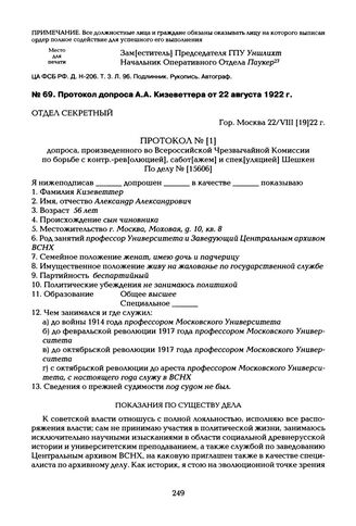 Протокол допроса А.А. Кизеветтера от 22 августа 1922 г.