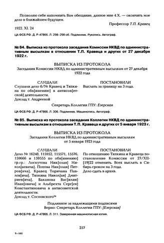 Выписка из протокола заседания Коллегии НКВД по административным высылкам в отношении Т.П. Кравеца и других от 5 января 1923 г.