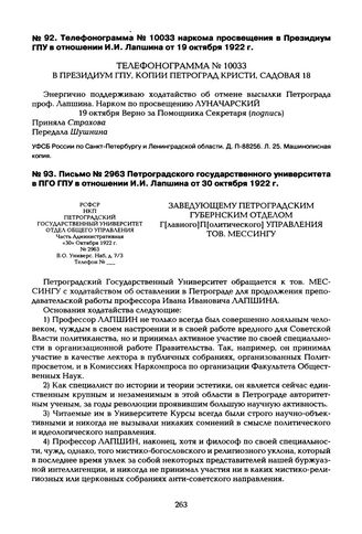 Письмо № 2963 Петроградского государственного университета в ПГО ГПУ в отношении И.И. Лапшина от 30 октября 1922 г. // УФСБ России по Санкт-Петербургу и Ленинградской области. Д. П-88256. Л. 29-30. Подлинник. Машинопись. Автограф.