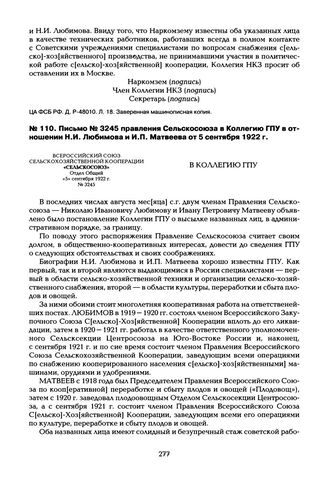 Письмо № 3245 правления Сельскосоюза в Коллегию ГПУ в отношении Н.И. Любимова и И.П. Матвеева от 5 сентября 1922 г. // ЦА ФСБ РФ. Д. Р-48010. Л. 31-32. Подлинник. Машинопись. Автограф.