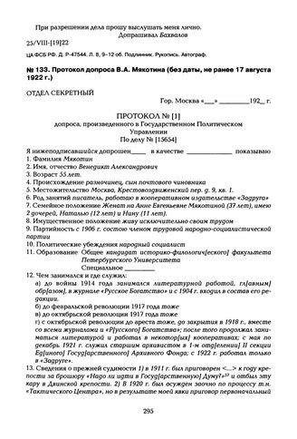 Протокол допроса В.А. Мякотина (без даты, не ранее 17 августа 1922 г.) // ЦА ФСБ РФ. Д. Н-206. Т. 7. Л. 238-239. Подлинник. Рукопись. Автограф.