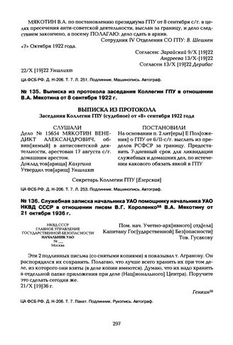Выписка из протокола заседания Коллегии ГПУ в отношении В.А. Мякотина от 8 сентября 1922 г. // ЦА ФСБ РФ. Д. Н-206. Т. 7. Л. 253. Подлинник. Машинопись. Автограф.