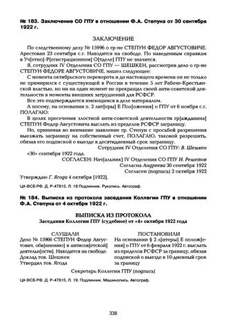 Выписка из протокола заседания Коллегии ГПУ в отношении Ф.А. Степуна от 4 октября 1922 г.