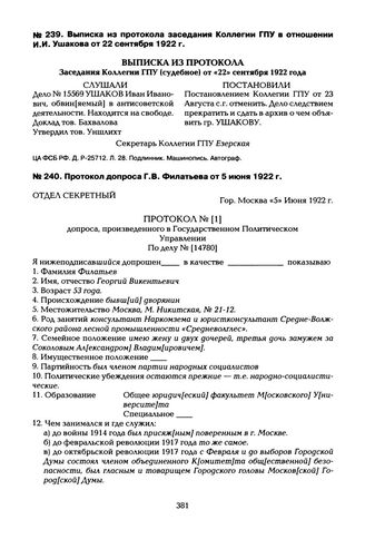 Выписка из протокола заседания Коллегии ГПУ в отношении И.И. Ушакова от 22 сентября 1922 г.