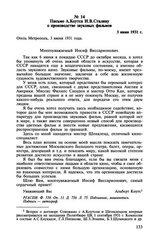 Письмо А. Коутса И.В. Сталину о производстве звуковых фильмов. 3 июня 1931 г.